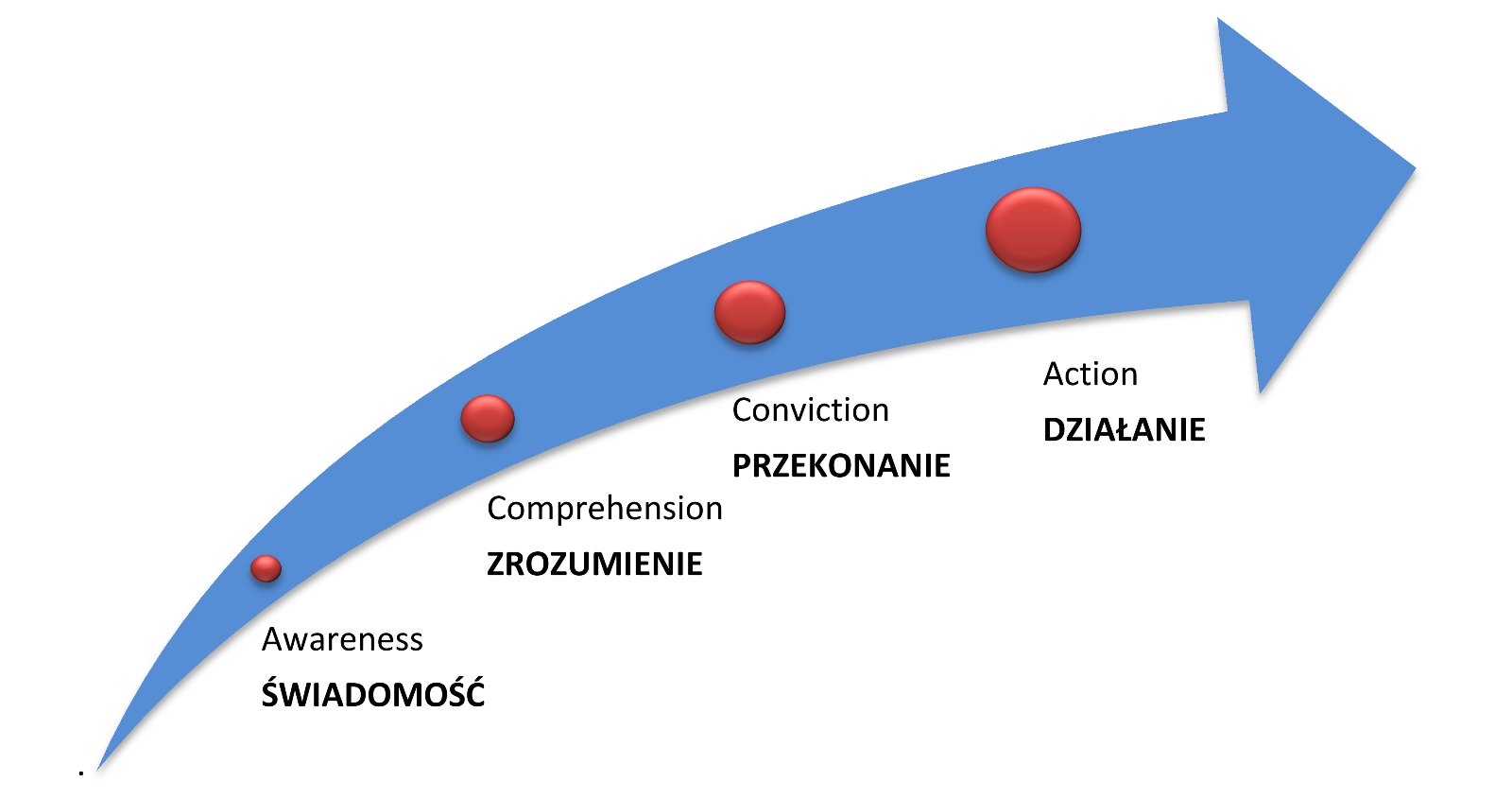 Zgodnie z modelem DAGMAR klient powinien najpierw zdobyć świadomość istnienia firmy i jej produktów. Kolejny etap to zrozumienie, polegające na przyswojeniu przez konsumenta haseł reklamowych i stworzeniu przez niego własnego, lecz pożądanego przez producenta, wyobrażenia o produkcie i korzyściach płynących z ewentualnego zakupu i posiadania go. Etap dotyczący przekonania obejmuje decyzję o chęci zakupu produktu, podsycaną np. przez informacje od klientów, którzy podobno zakupili już dany produkt, lub ekspertów (np. farmaceutów, lekarzy, fryzjerów, doświadczonych rodziców). Ostatni etap wpływu reklamy na konsumenta to działanie, czyli czynność bezpośrednio prowadząca do zakupu, co jest wspierane przez odpowiednie zabiegi ułatwiające dostęp do produktu, np. odpowiednią ekspozycję towaru, rozdawanie próbek.